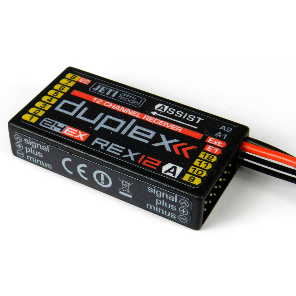 12 kanálový prijímač so stabilizáciou, podpora pre LED pás a možnosť softvéroveho rozšírenia o vário a výškomer. Prijímač má dva užívateľsky nastaviteľné výstupy E1 a E2 s možnosťou nastavenia pre servo, JETIBOX/Sensor EX, PPM výstup, PPM vstup, EX Bus výstup, UDI výstup, S.BUS. Možnosť priameho pripojenia až troch telemetrických senzorov. Integrovaný systém ASSIST je pokročilý stabilizačný systém so širokou škálou používateľských nastavení pre modely lietadiel a koptér