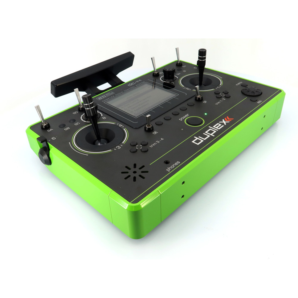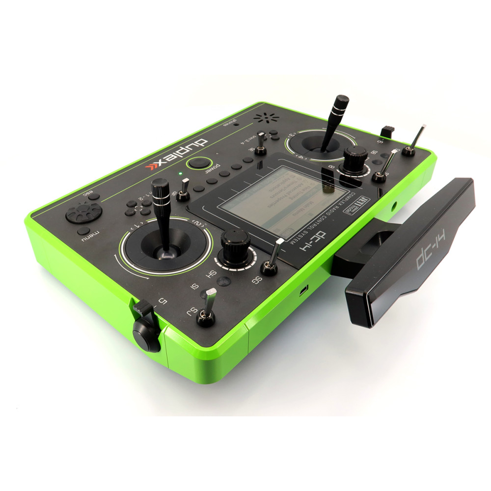 DC-14 II (Rev.2) prináša prehľadné používateľské rozhranie s pohodlným ovládaním pomocou rotačného ovládača a funkčných tlačidiel. Na hornej strane je farebný 3,5" TFT displej (320 × 240 px) s dobrým pozorovacím uhlom a čitateľnosťou, vhodný na zobrazenie telemetrie aj vo forme grafov (pri rozšírení). Vysielač podporuje zvukové upozornenia a alarmy, prehrávanie audia a má USB konektor pre pripojenie k počítaču, aktualizácie a prenos dát.