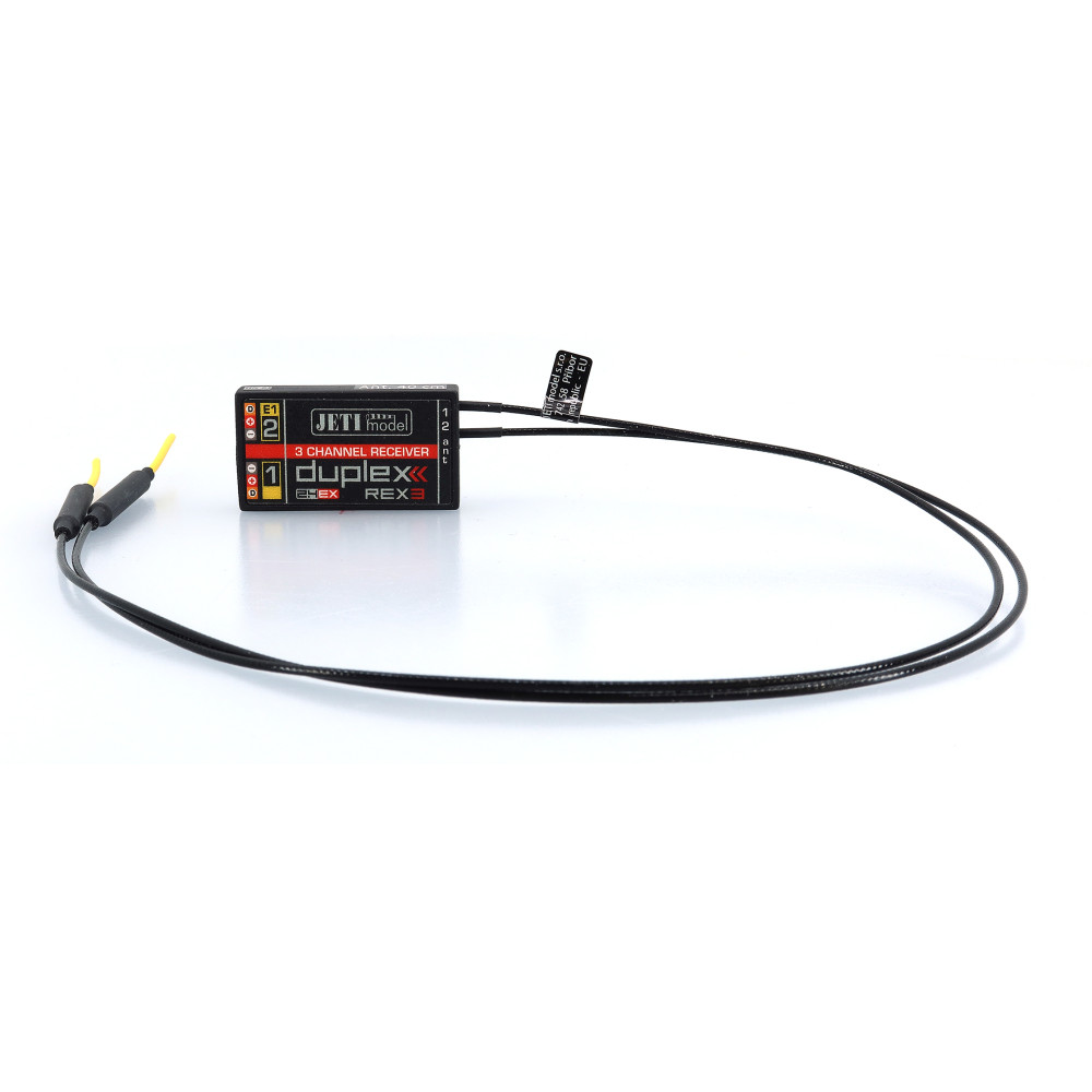3-kanálový plochý prijímač s anténami dĺžky 40 cm s dvoma nastaviteľnými výstupmi E1, E2. Nastaviteľné výstupy podporujú servo, snímač JETIBOX/EX, výstup PPM, vstup PPM, výstup EX Bus, výstup UDI a S.BUS.