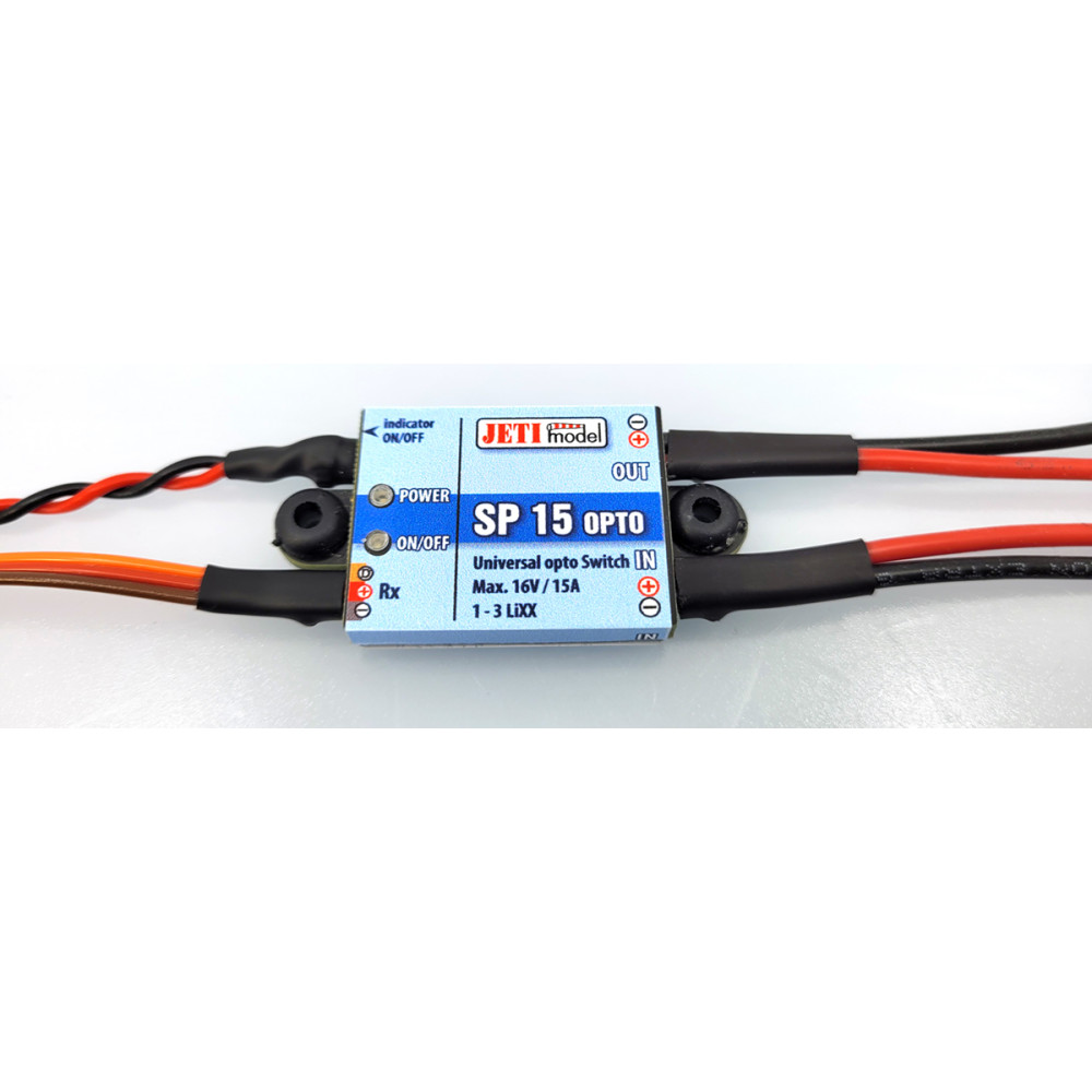 Elektronický spínač JETI SP 15 OPTO je určený predovšetkým na spoľahlivé spínanie zapaľovania benzínových leteckých motorov. Vďaka optickému oddeleniu (OPTO) minimalizuje rušenie medzi pohonnou časťou a prijímačom, čo zvyšuje bezpečnosť prevádzky modelu.